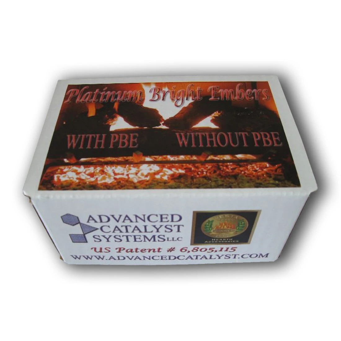 Platinum Bright Embers (PBE) are catalytic embers for your vented gas fireplace or log set. When placed on top of existing mineral wool ember beds, the catalytic embers combust unburned fuel from the burner to provide a dynamically more realistic looking ember. In addition to creating a bright flickering appearance like that of real wood ember beds, these embers radiate broadband infrared heat thus creating a warmer fire and reducing the formation of soot on gas logs.