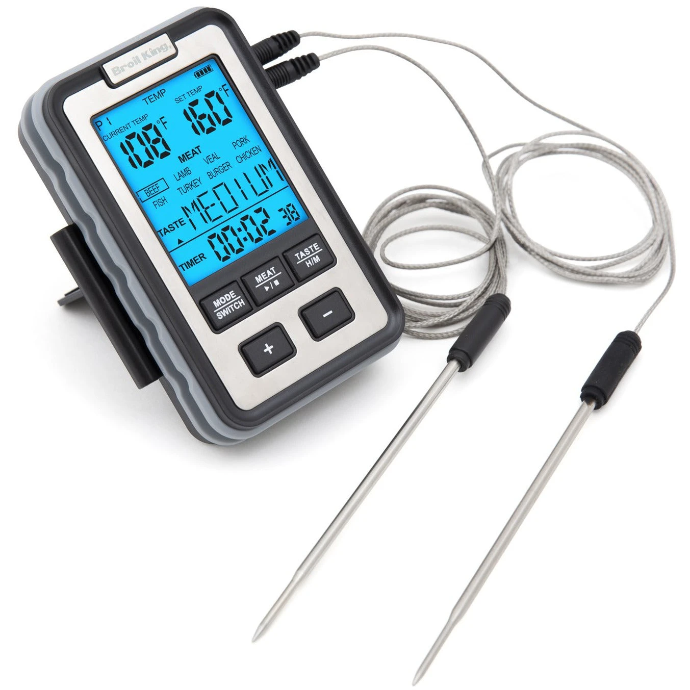 Monitor the whole cookout – reads two temperatures at one time. Two cuts of meat, no problem; a roast and the ambient grill temperature, no sweat. Integrated countdown timer and a wide range of target doneness for each cut of meat. Backlit screen, batteries not included.