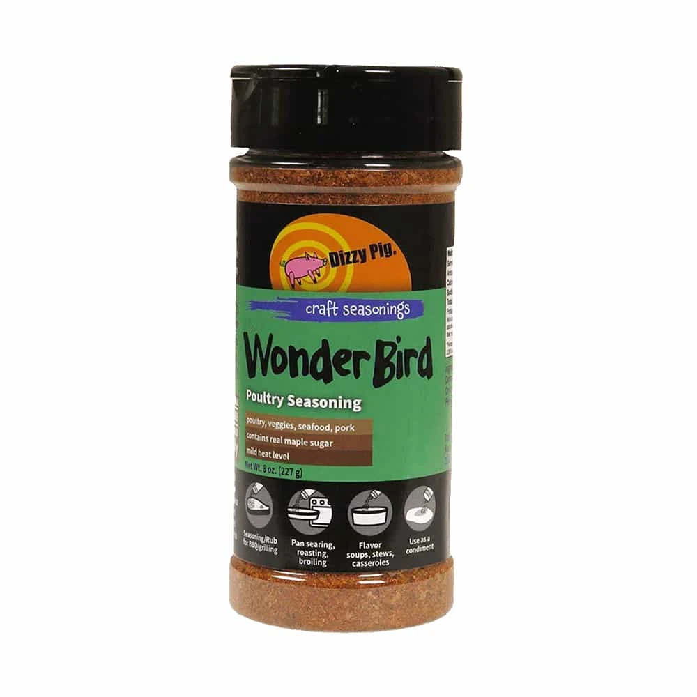 Spice up your grilled chicken or Thanksgiving turkey with Wonder Bird Seasoning Spice BBQ Rub by Dizzy Pig! A mouthwatering mix of citrus, garlic, maple, herbs, and spices, Wonder Bird is ideal for chicken, turkey, Cornish hens, and game birds! With hints of lemon and orange peel, garlic, peppercorns, and pure maple sugar, Wonder Bird is also delicious on pork, vegetables, and seafood. Use Wonder Bird all-purpose poultry seasoning for roasting, broiling, pan-searing, and as a Barbeque rub! Also great for seasoning soups, stews, and more! Dizzy Pig products are all-natural and contain no wheat gluten, dairy, MSG, peanuts, or tree nuts. Heat level: Mild. Size: 8 oz (190 grams)