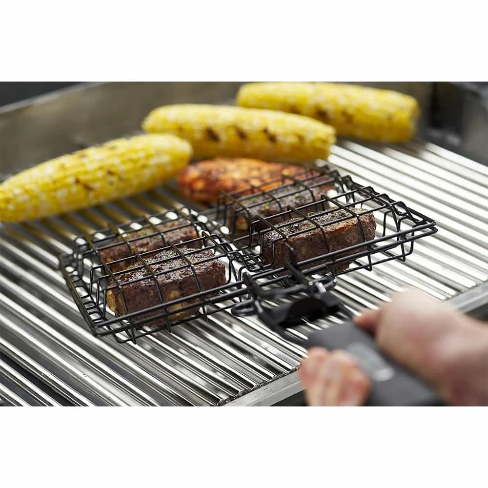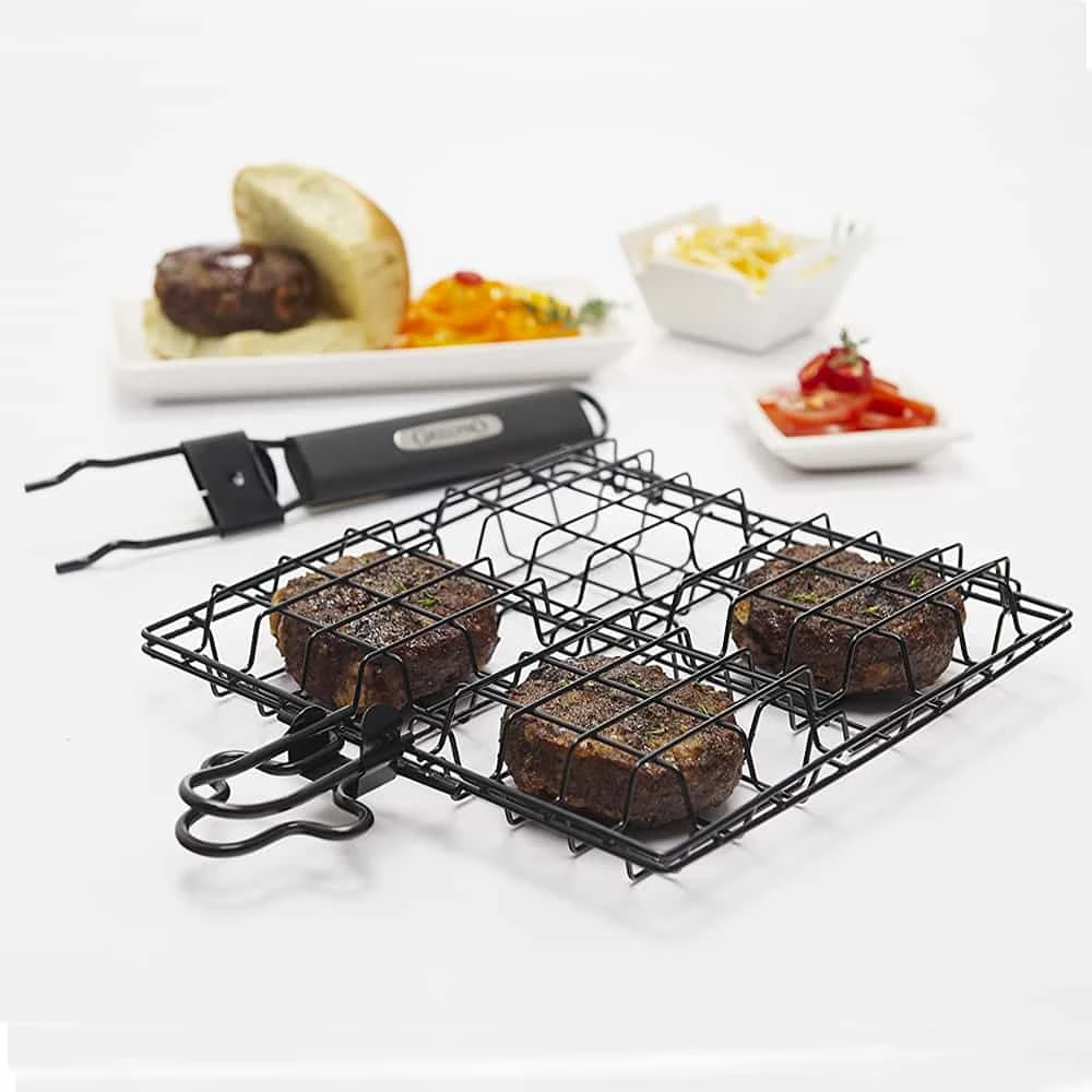 This non-stick stuffed burger basket holds 4 large burgers at a time, has a locking lid and detachable soft-grip handle.