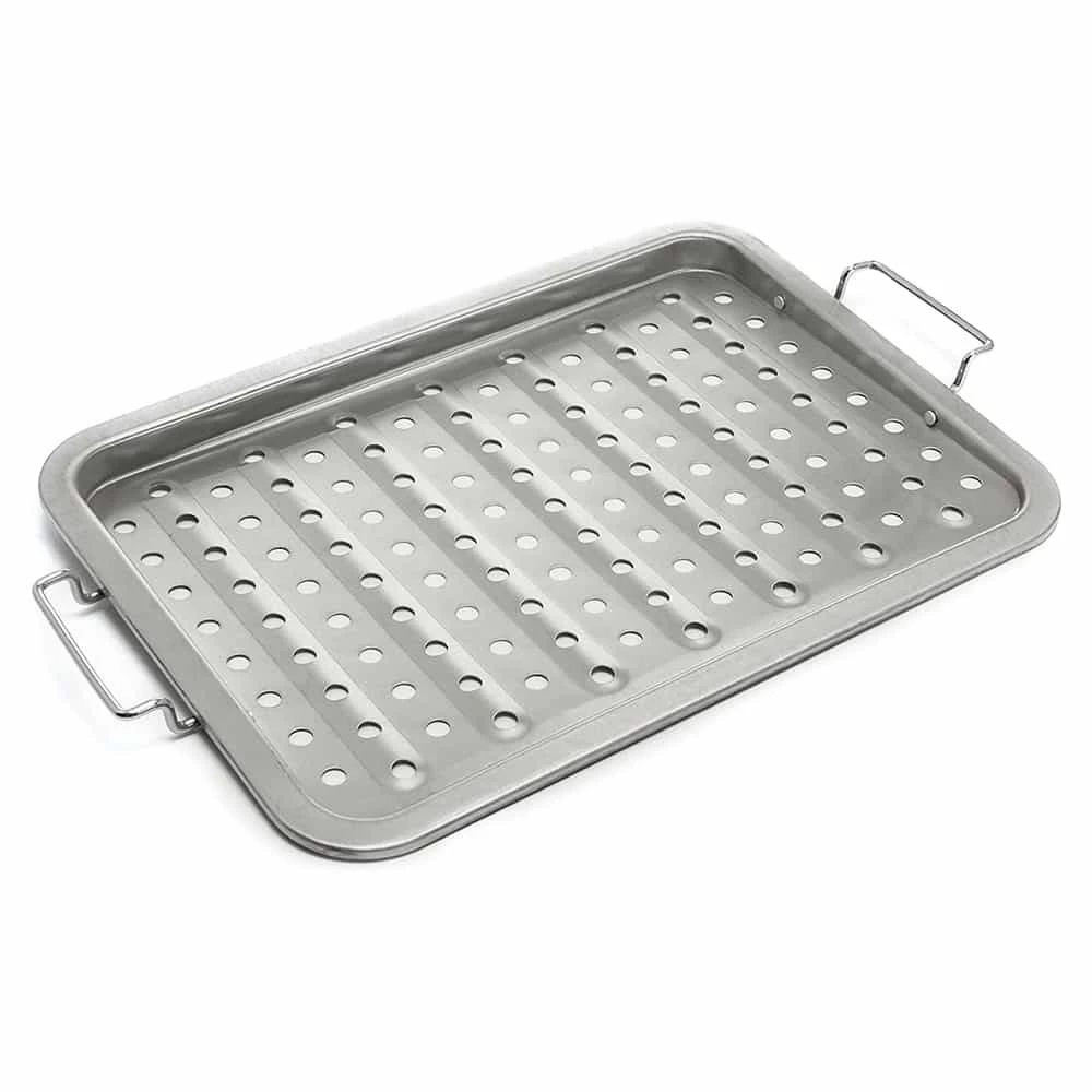 11″ x 16″ stainless steel grilling topper with stainless handles and raised contours. The single draw design improves functionality and rigidity, it also makes it much easier to clean.
