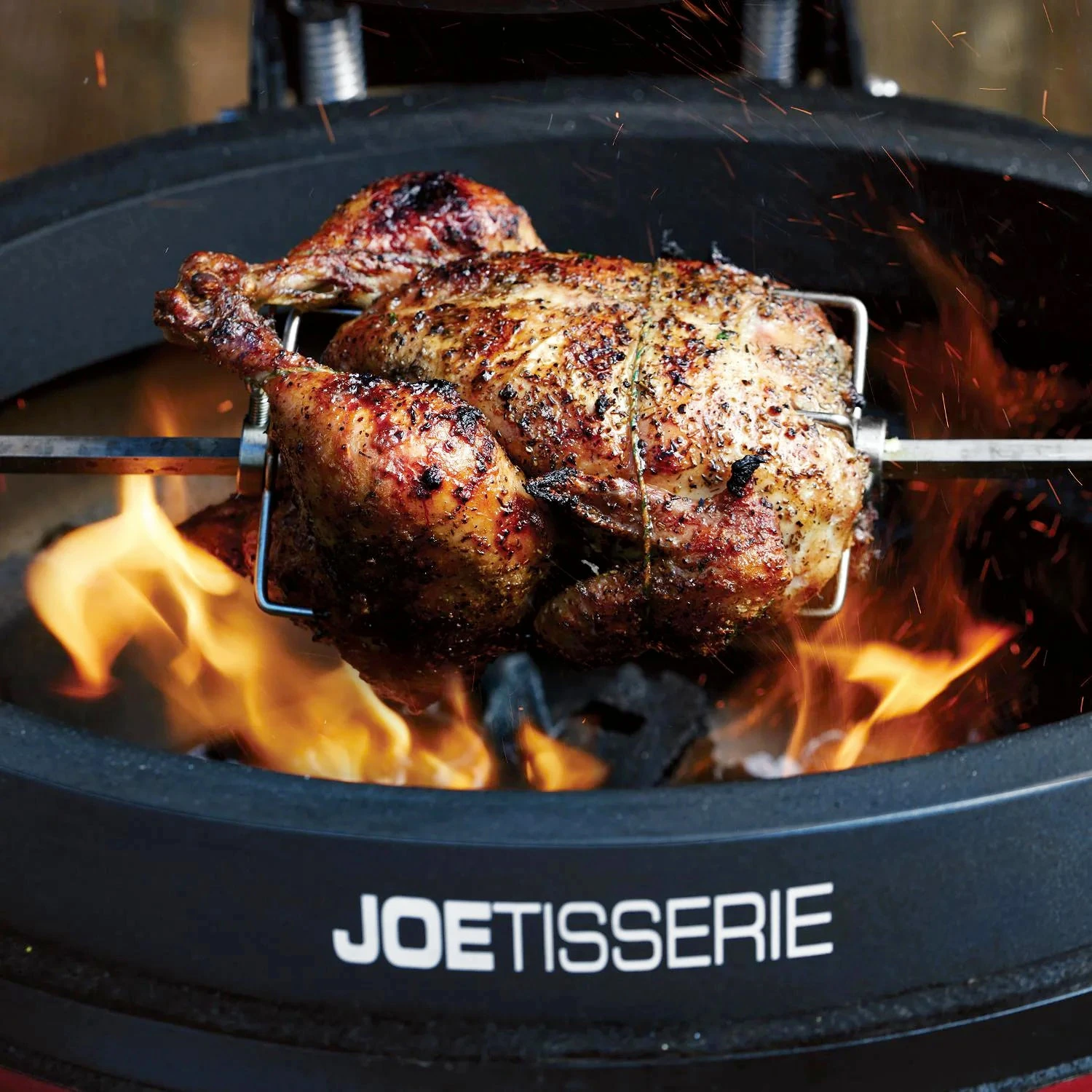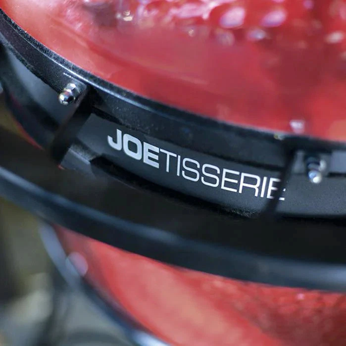The innovative JoeTisserie transforms your Kamado Joe Ceramic Grill into a rotisserie-style grill. The spit rod and forks are constructed from durable, 304-grade stainless steel and are adjustable for perfect balance and steady rotation. The unique cast aluminum ring is thicker on the front and thinner towards the back of the grill, which allows the kamado lid to close. The spit rod and forks are constructed from durable, 304-grade stainless steel and are adjustable for perfect balance and steady rotation. Turn up to 50 pounds of beef, pork, or chicken with a powerful yet quiet 120V motor. The rotisserie kit is easy to install and dishwasher safe for easy cleanup.
