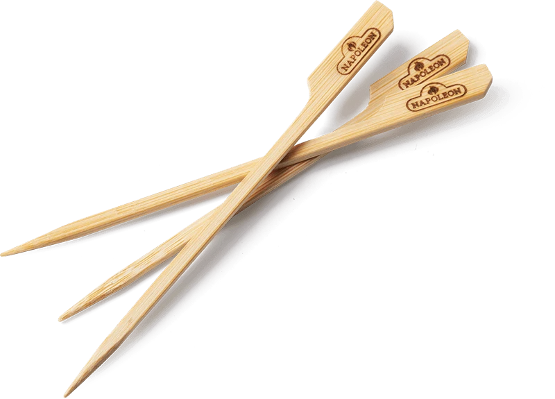 These 6-inch Bamboo Skewers are fantastic for appetizer-sized kebabs and other delicious foods, grilled or not. These Skewers are sturdy and just the right width that food won’t split or spin around while loading them for the perfect meal or presentation. The tab on the end makes these Bamboo Skewers easy to pick up and even easier for you to use tongs to turn them on the barbecue grill. They’re ideal for a beautiful presentation and sourced from a renewable resource. These skewers are disposable or recyclable, so cleanup is a breeze. Load these 6-inch Bamboo Skewers ahead of time and freeze them, keep them in the fridge or store them at room temperature without concern about changes to the material or negative effects to the foods that have been skewered. Clever, multifunctional and easy to maintain, every kitchen benefits from the addition of a Napoleon barbecue accessory. Our accessories provide you with the essentials to create delicious grilled food and then some to enhance your cooking arsenal with a wide variety of creative additions to broaden your culinary horizons