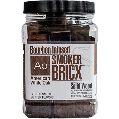 Smoker Bricx Bourbon Infused American Oak BBQ Smoking Chunks 32oz. This is a classic smoke wood. Pairs well with just about any meat, fish or fowl, imparting a medium smoky flavor that is stronger than our apple and black cherry, but lighter than hickory. Medium classic smoke, pairs with meat, fish or fowl. Good choice for larger cuts of meat with long smoker times. Cut to size, moisture controlled and infused with bourbon. No bark, no sawdust, and no fillers. Packed wet, packed fresh. There’s more aroma, better flavor, and great smoke.